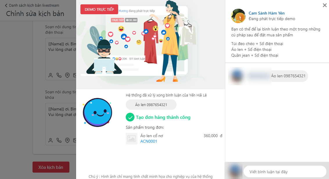 Ngoài ra, bạn có thể Xem Demo kịch bản trước khi kích hoạt. Bạn có thể comment test, nếu bình luận sai cú pháp thì hệ thống sẽ thông báo lỗi, comment chính xác thì đơn hàng sẽ được tạo tự động.