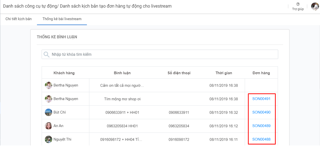 Khi thực hiện livestream, chỉ cần trong comment của khách hàng có chứa từ “váy”/”đầm”/”vay” thì 1 đơn hàng có chứa sản phẩm Váy đầm đuôi cá với thông tin khách hàng bao gồm tên và số điện thoại sẽ được tạo tự động. Tương tự với các sản phẩm khác cũng vậy.