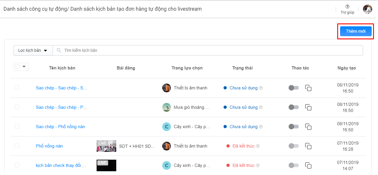 Ở màn hình tiếp theo, bạn click nút Thêm mới kịch bản tạo đơn hàng tự động cho bài viết livestream.