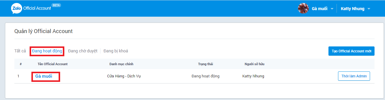 Bước 1: Bạn sẽ nhìn thấy tên Page Zalo và trạng thái Đang hoạt động. Bạn Click vào phần Tên Page.
