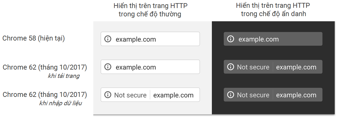 Ngoài ra, Chrome cũng lưu ý rằng khi người dùng truy cập bằng chế độ ẩn danh,  cảnh báo “Không bảo mật” sẽ xuất hiện trên tất cả các website HTTP. Các thay đổi này sẽ được Google cập nhật với Chrome 62 trong tháng 10 tới đây.
