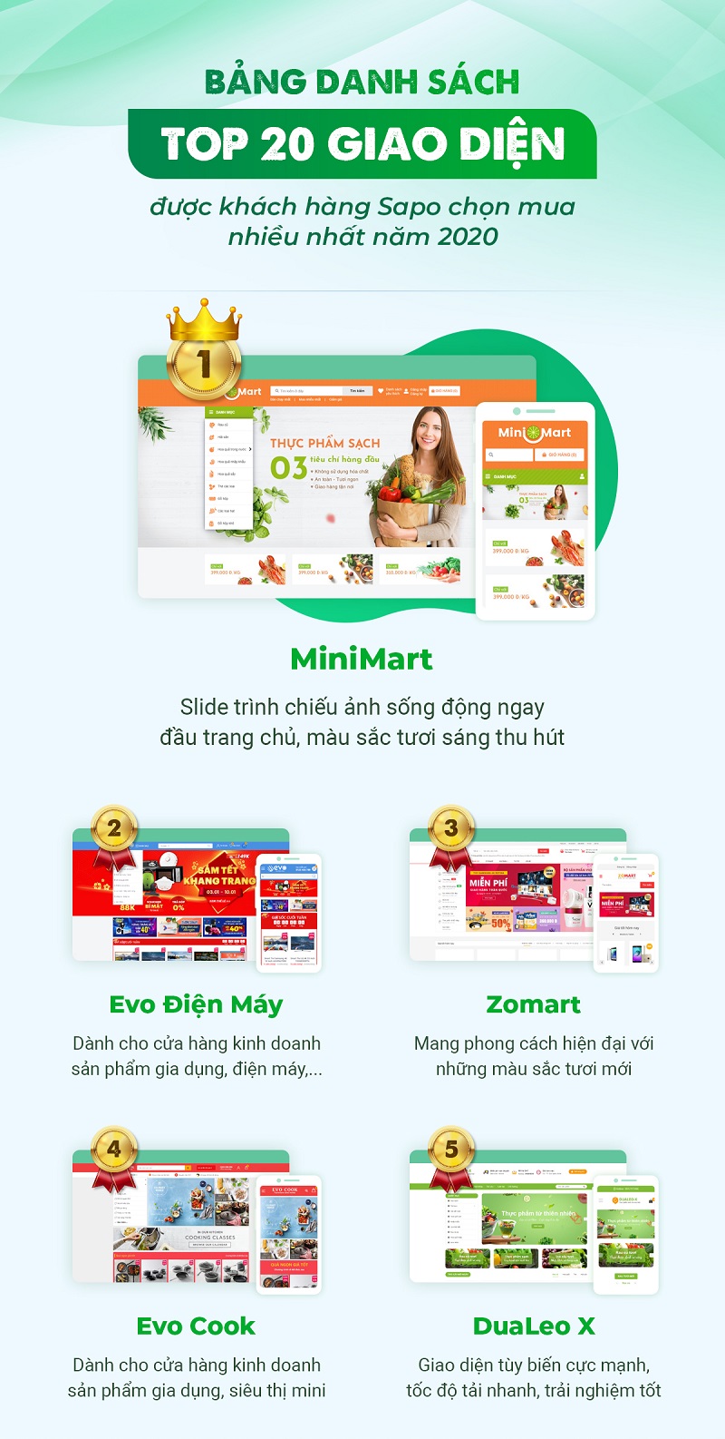 5 vị trí đứng đầu trong danh sách top 20 giao diện web được khách hàng Sapo chọn mua nhiều nhất